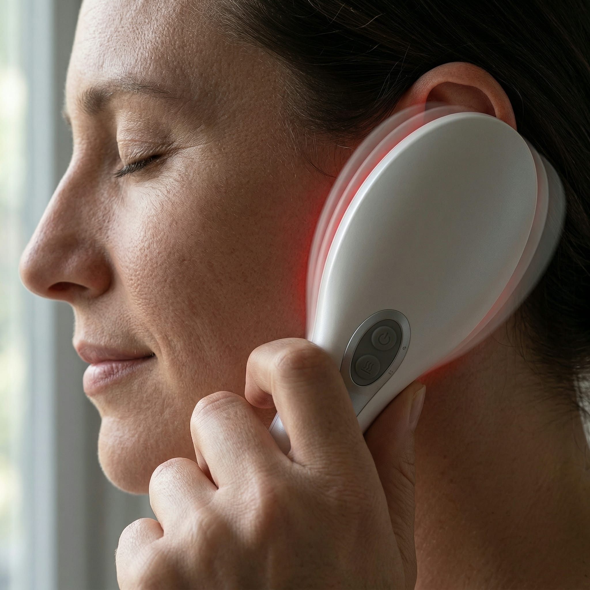將梳齒輕壓於耳甲腔與耳垂周圍(迷走神經最密集處)。感受磁能震動帶來的酥麻溫熱感,這能瞬間喚醒副交感神經,解除全身緊繃。
